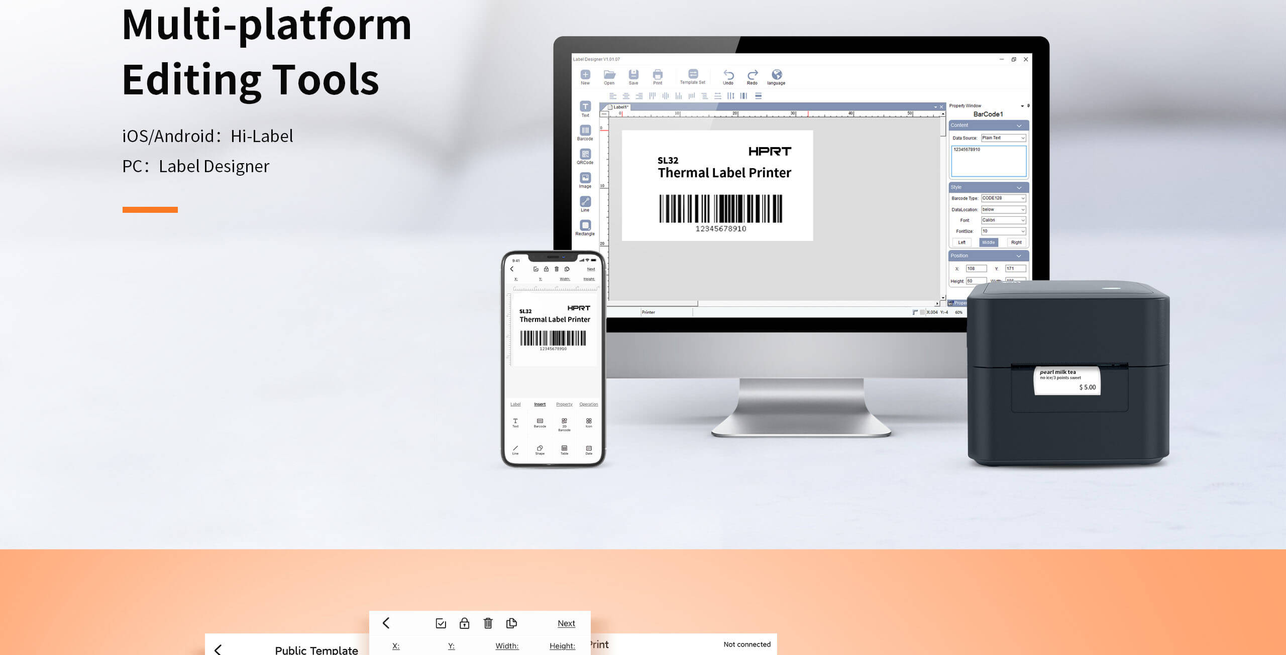 Máy in mã vạch HPRT D25BT. In nhiệt trực tiếp. Độ phân giải: 203 DPI. Chiều rộng in: 48mm. Chiều rộng giấy: 20 ~ 60mm. Tốc độ in: 76 mm / giây. Bộ nhớ: DRAM: 4M FLASH: 4M. Cổng giao tiếp: USB+BLUETOOTH. Đường kính cuộn: tối đa 80mm. Đường kính lõi: tối thiểu 25mm.